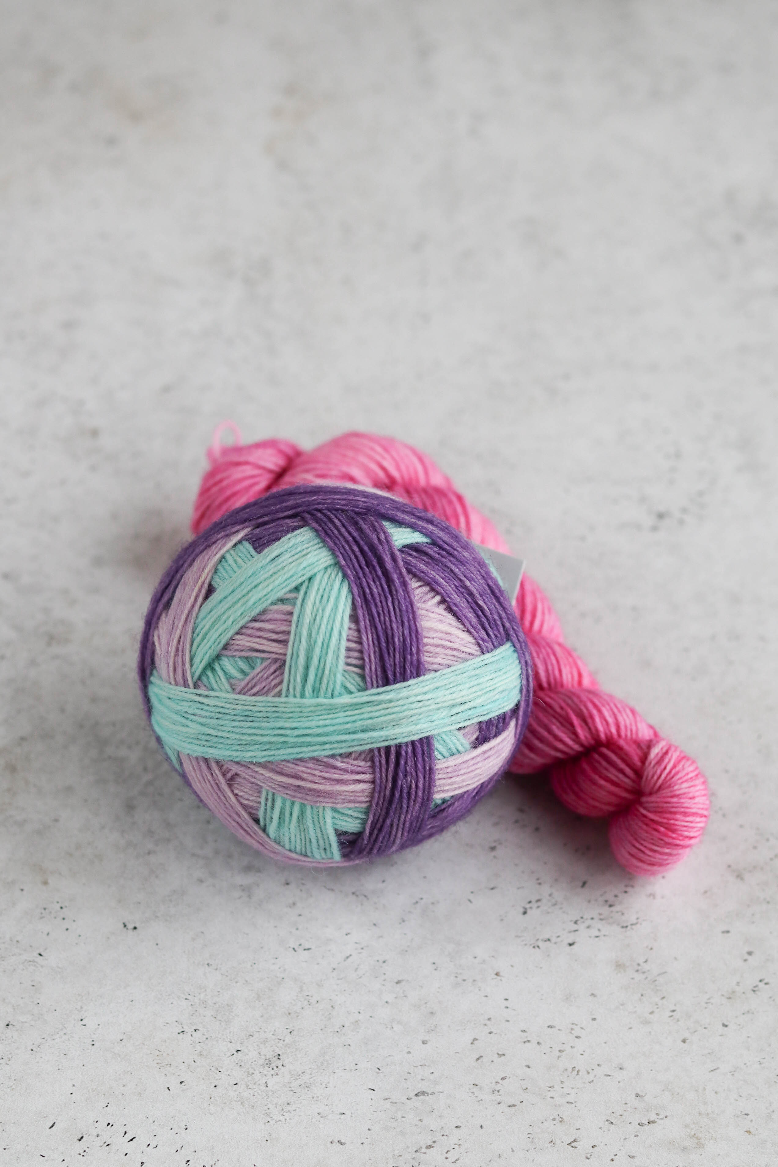 Вся пряжа окрашена вручную, поэтому двух идентичных пасм не бывает. В однотонных расцветках могут быть как светлые, так и темные участки. В секционных расцветках крапинки и секции варьируются от пасмы к пасме.
