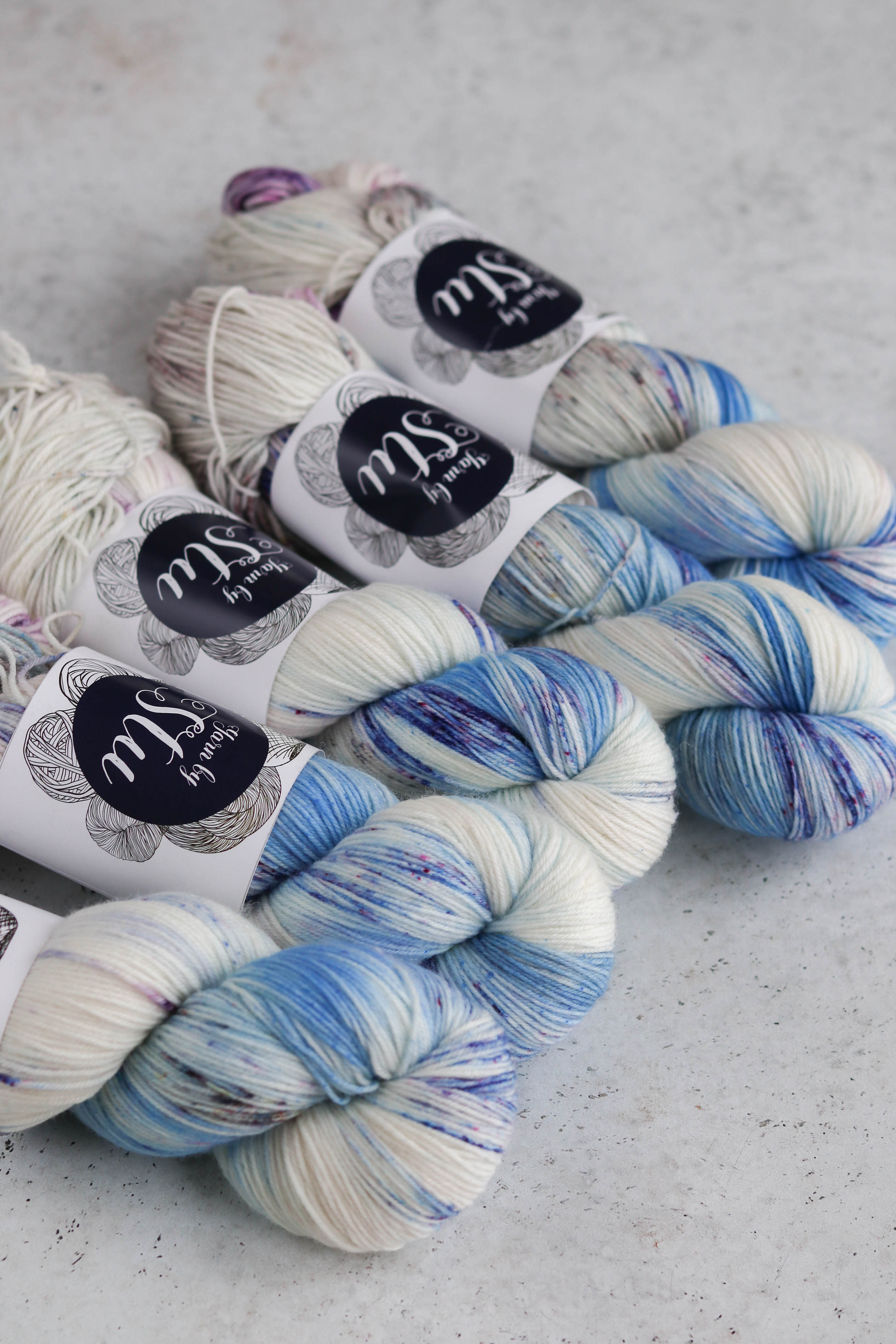 Вся пряжа окрашена вручную, поэтому двух идентичных пасм не бывает. В однотонных расцветках могут быть как светлые, так и темные участки. В секционных расцветках крапинки и секции варьируются от пасмы к пасме.