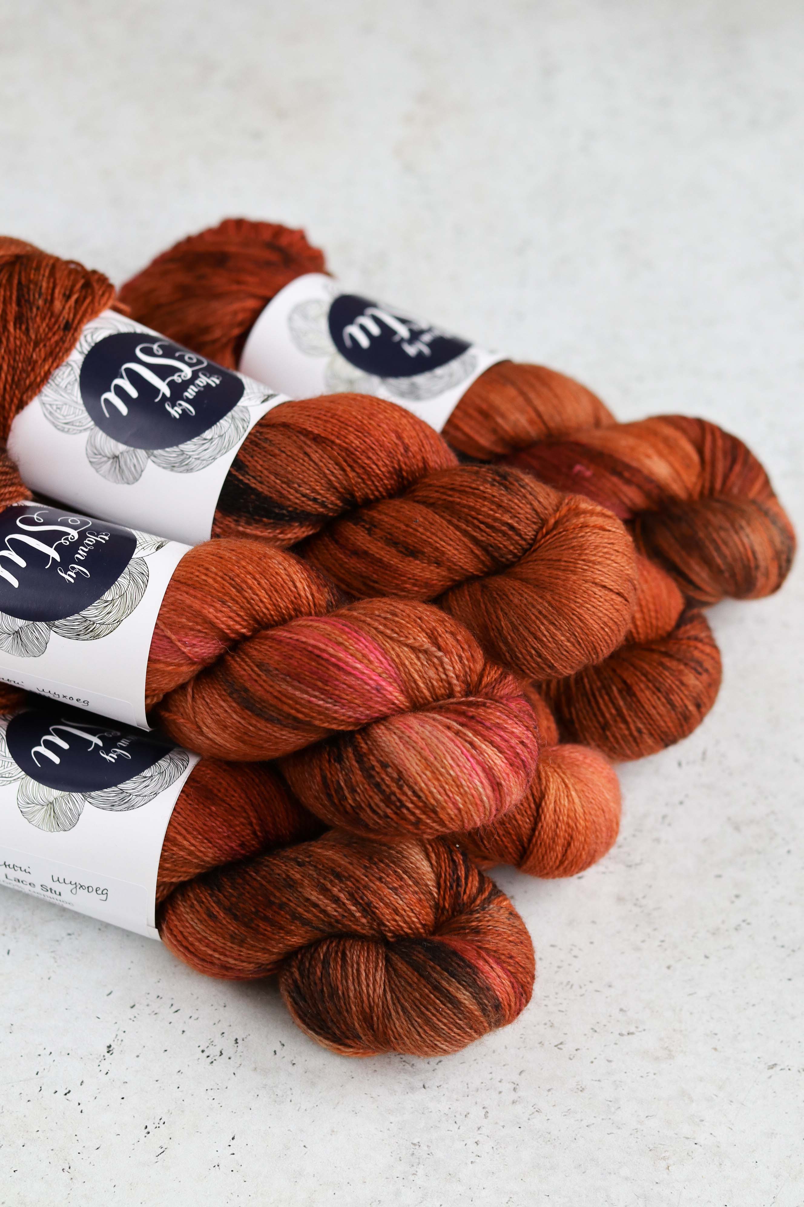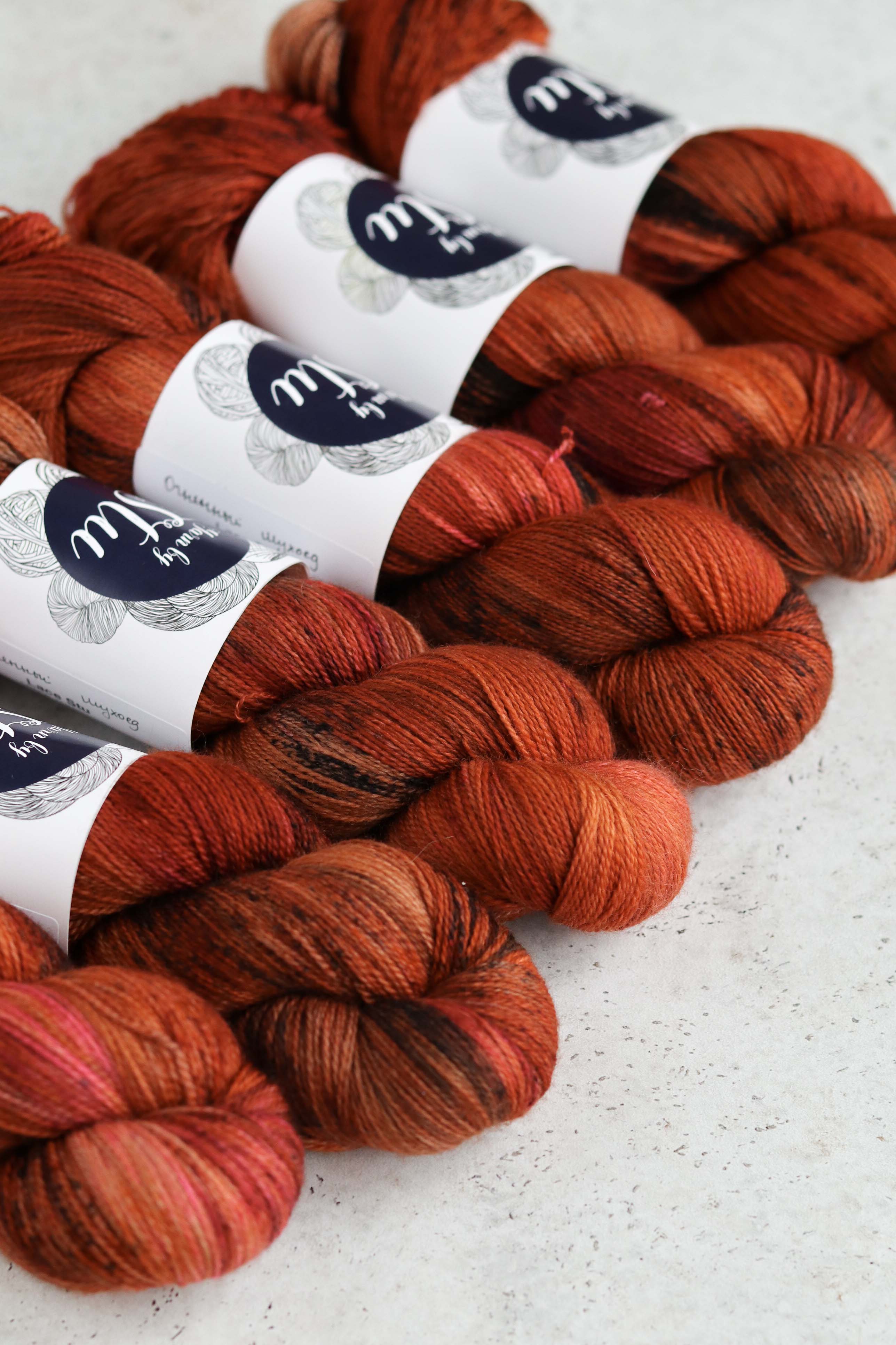 Вся пряжа окрашена вручную, поэтому двух идентичных пасм не бывает. В однотонных расцветках могут быть как светлые, так и темные участки. В секционных расцветках крапинки и секции варьируются от пасмы к пасме.