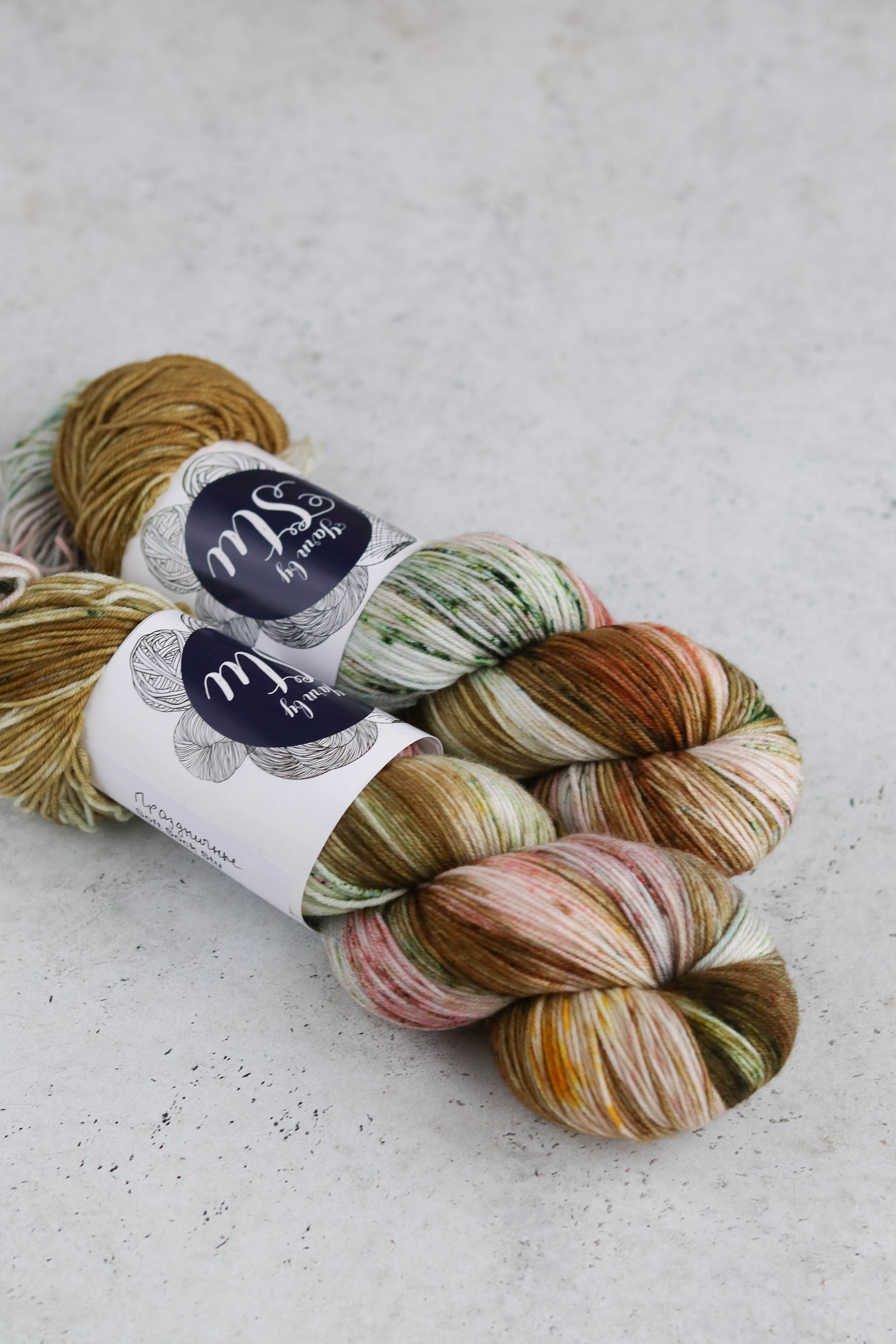 Вся пряжа окрашена вручную, поэтому двух идентичных пасм не бывает. В однотонных расцветках могут быть как светлые, так и темные участки. В секционных расцветках крапинки и секции варьируются от пасмы к пасме.