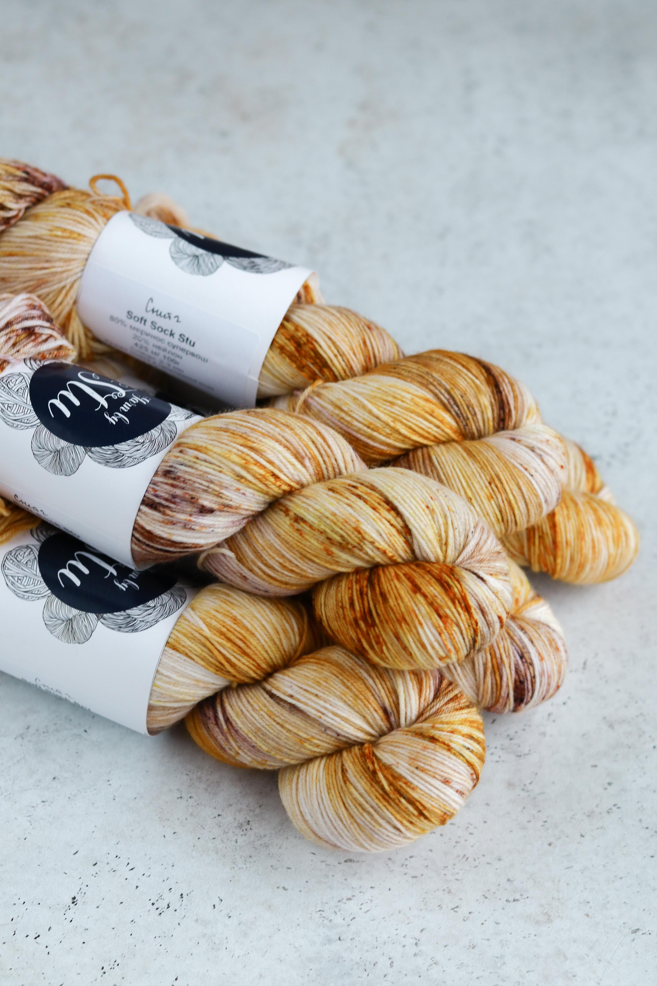 Вся пряжа окрашена вручную, поэтому двух идентичных пасм не бывает. В однотонных расцветках могут быть как светлые, так и темные участки. В секционных расцветках крапинки и секции варьируются от пасмы к пасме.
