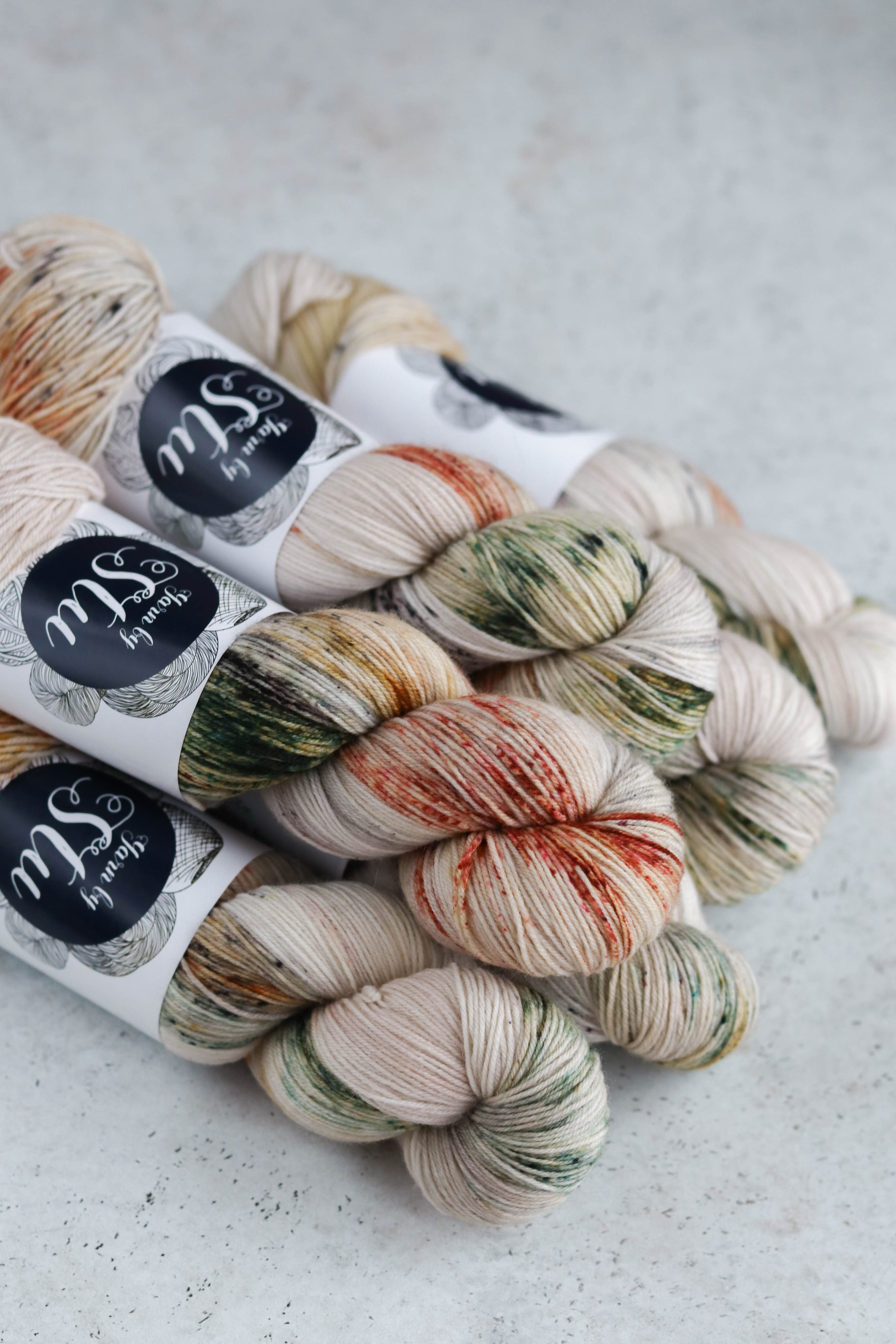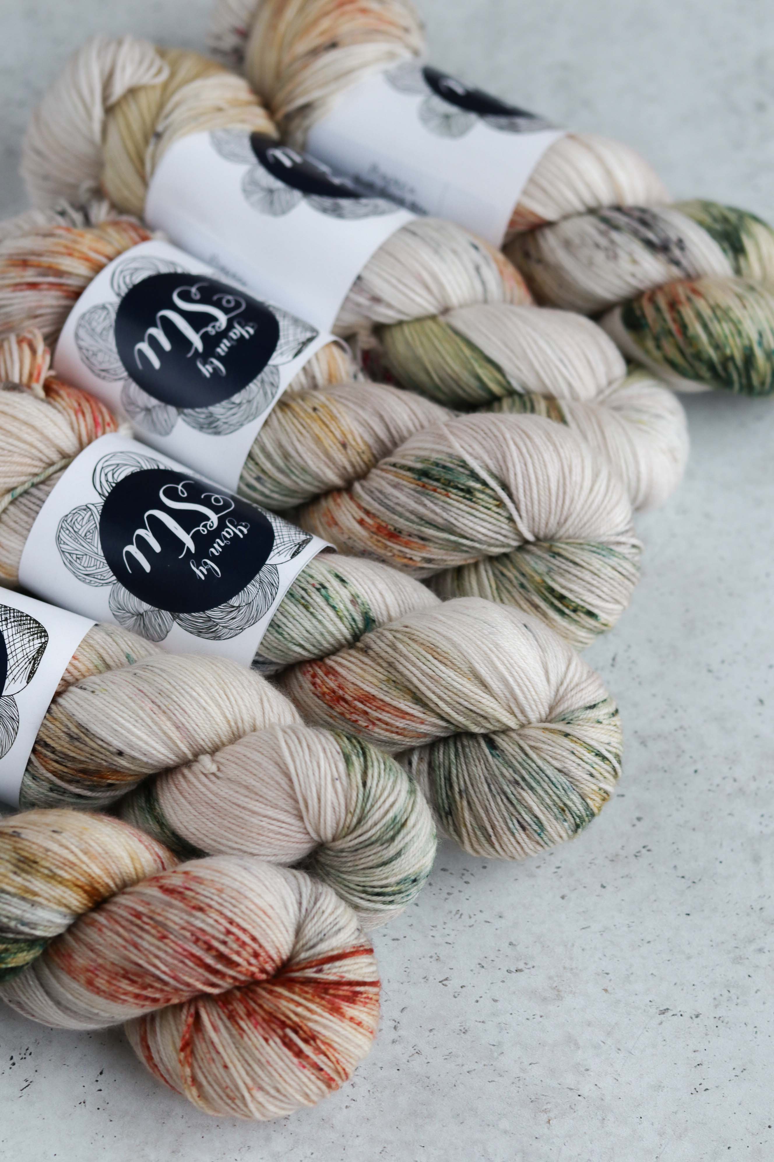 Вся пряжа окрашена вручную, поэтому двух идентичных пасм не бывает. В однотонных расцветках могут быть как светлые, так и темные участки. В секционных расцветках крапинки и секции варьируются от пасмы к пасме.