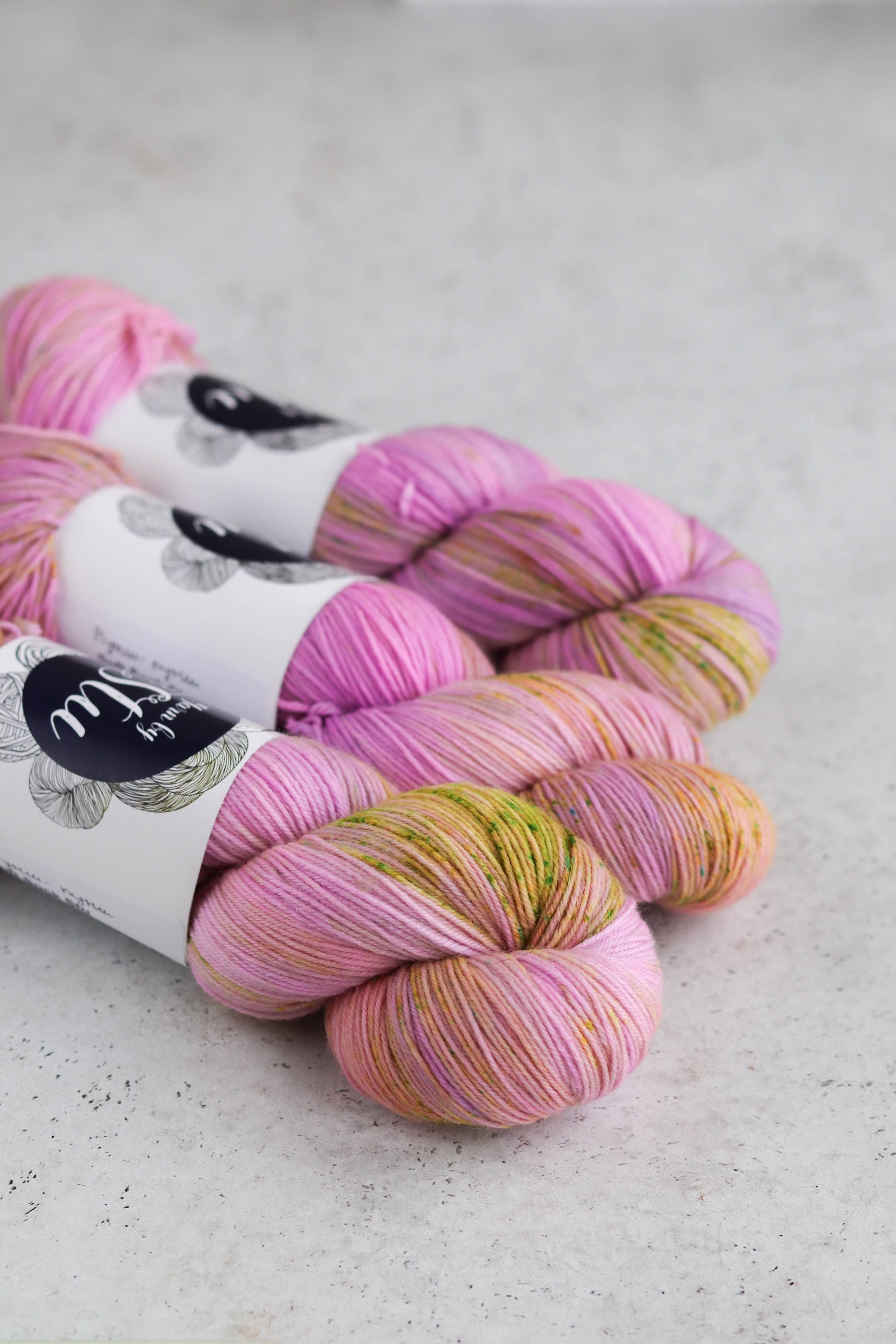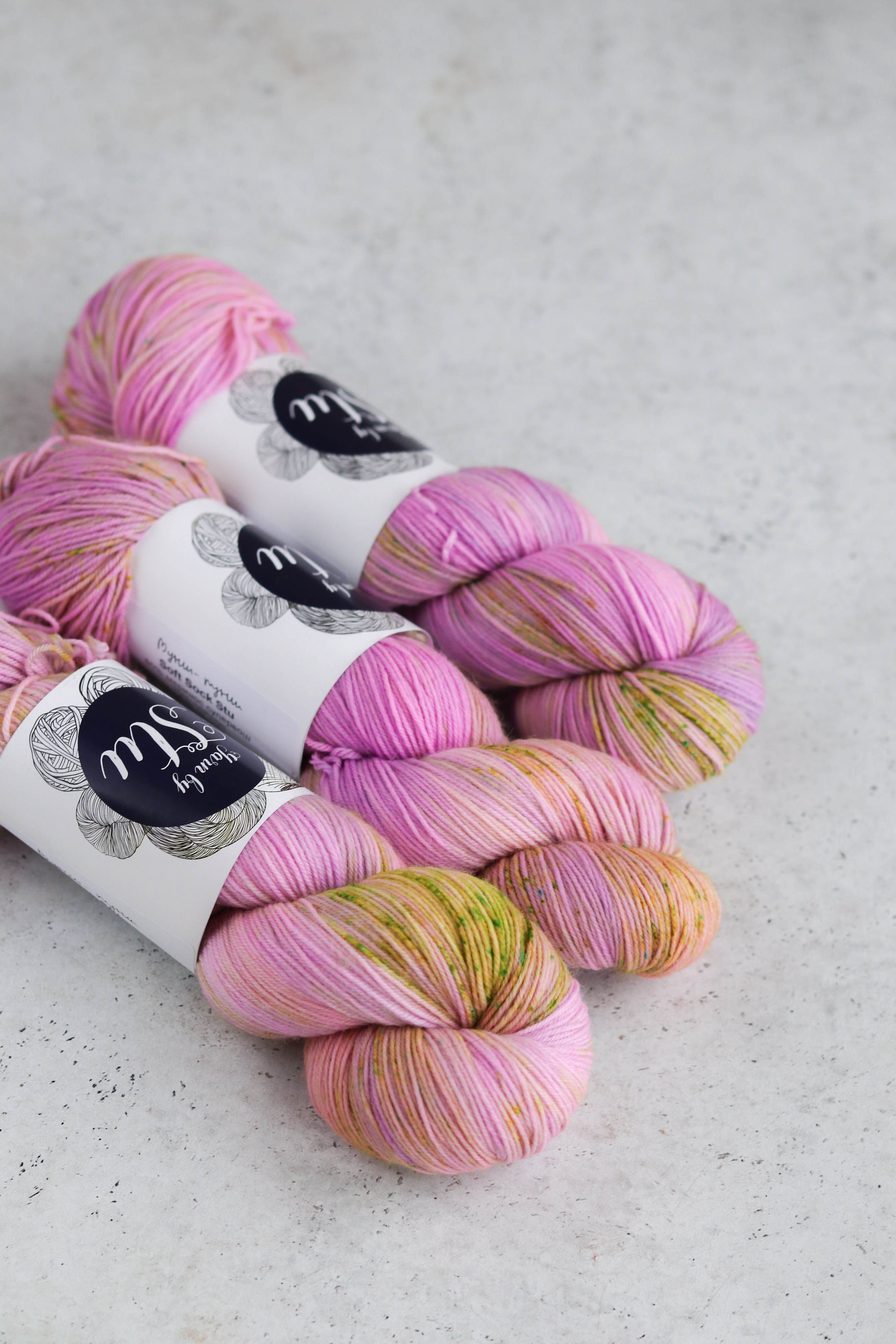 Вся пряжа окрашена вручную, поэтому двух идентичных пасм не бывает. В однотонных расцветках могут быть как светлые, так и темные участки. В секционных расцветках крапинки и секции варьируются от пасмы к пасме.